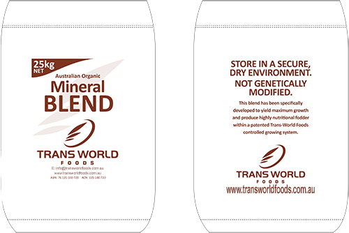 Our blend has been specifically developed to yield maximum growth an produce highly nutritional fodder within our patented Trans-World Foods (aust) controlled growing system.The mineral blend: